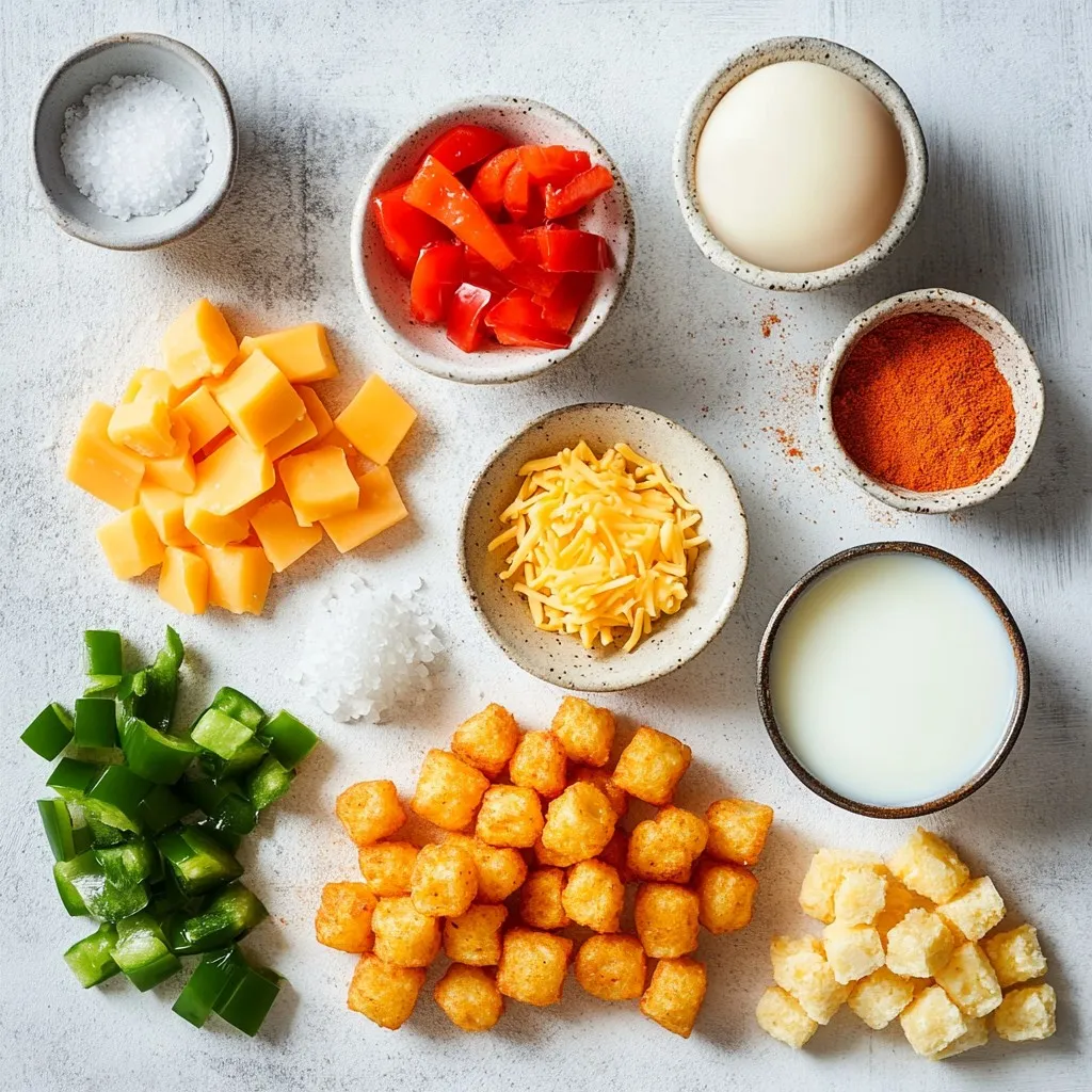 These simple ingredients combine to create a hearty dish. The frozen tater tots form a crispy base that holds all the flavors. The sausage adds a savory touch, while the eggs and milk create a fluffy texture. Cheese melts into gooey goodness, making each bite delightful. Fresh vegetables like bell peppers and onion add color and crunch. Spices like garlic powder and smoked paprika bring warmth and depth.