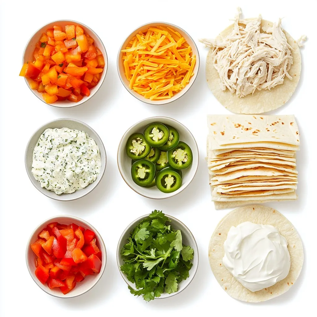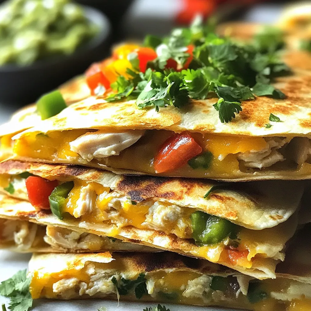 - 2 cups cooked chicken, shredded - 1 cup shredded cheddar cheese - 1 cup shredded Monterey Jack cheese - 1/2 cup cream cheese, softened - 1 medium red bell pepper, diced - 1 medium green bell pepper, diced - 1/2 onion, finely chopped - 1 jalapeño, minced (optional for a spicy kick) The core of my ultimate chicken quesadillas is the filling. You need cooked chicken, shredded for easy mixing. I love using both cheddar and Monterey Jack cheeses. They melt beautifully and add a rich flavor. Cream cheese brings a creamy texture that binds everything together. The fresh crunch of diced bell peppers adds color and taste. Don’t forget the onion and optional jalapeño for some heat. - 1 teaspoon garlic powder - 1 teaspoon ground cumin - 1 teaspoon smoked paprika - Salt and pepper to taste Seasonings make a big difference. Garlic powder adds depth, while cumin gives a warm, earthy flavor. Smoked paprika adds a hint of smokiness. Salt and pepper enhance all the flavors. Mix these well into your filling for a full taste experience. - 4 large flour tortillas - 2 tablespoons olive oil For the quesadillas, I prefer large flour tortillas. They hold the filling well and get nice and crispy. Olive oil is essential for cooking. It helps achieve a golden, crunchy exterior. Just remember to coat your skillet with it before cooking. {{ingredient_image_2}} To make the filling, start by gathering all your ingredients. In a large bowl, combine the shredded chicken, cheddar cheese, Monterey Jack cheese, and softened cream cheese. Next, add the diced red bell pepper, green bell pepper, chopped onion, and minced jalapeño if you want some spice. Season this mixture with garlic powder, ground cumin, smoked paprika, and a pinch of salt and pepper. Mix it well until everything is creamy and evenly combined. Now, let’s cook! Heat 1 tablespoon of olive oil in a large skillet over medium heat until it shimmers. Once hot, lay one tortilla flat in the skillet. Evenly sprinkle half of the chicken and cheese mixture over one half of the tortilla. Gently fold the tortilla in half so it covers the filling completely. Cook for 3-4 minutes until the bottom turns golden brown and the cheese melts. After 3-4 minutes, use a spatula to carefully flip the quesadilla over. Cook for another 3-4 minutes on the other side until it is crispy and golden brown. Once done, transfer the quesadilla to a cutting board. Let it cool for a minute before slicing it into wedges. Repeat this process with the remaining tortillas and filling. Add more olive oil as needed to prevent sticking. Serve the quesadillas warm, garnished with fresh cilantro, and enjoy with sour cream or guacamole on the side. To cook your quesadilla just right, keep the heat on medium. This allows the cheese to melt without burning the tortilla. Cook each side for about 3-4 minutes. Look for a golden brown color. This means your quesadilla is ready to flip. For perfect cheese melt, mix both cheddar and Monterey Jack. They melt well and give great flavor. If you want to switch things up, try different cheeses. Pepper jack works well if you like spice. You can also use gouda for a unique taste. For veggies, swap bell peppers for spinach or mushrooms. If you want a milder dish, skip the jalapeño. Use sweet corn instead for a fresh touch. A non-stick skillet is best for making quesadillas. It helps prevent sticking and makes flipping easier. A spatula with a wide edge is great for lifting the quesadilla. You can also use a quesadilla maker if you have one. It cooks evenly and keeps the quesadillas perfectly shaped. Pro Tips Use Fresh Ingredients: Fresh vegetables and high-quality cheese make a significant difference in flavor. Opt for freshly shredded cheese for better melting and taste. Experiment with Fillings: Feel free to add other ingredients like black beans, corn, or different types of cheese to customize your quesadillas to your liking. Get the Right Heat: Ensure your skillet is preheated properly before cooking. This helps achieve that crispy golden crust without burning. Serve with Dips: Enhance your quesadilla experience by serving with a variety of dips like salsa, sour cream, or guacamole for extra flavor and fun. {{image_4}} You can switch chicken for other proteins. Beef works well, too. Use ground beef or steak strips. Shrimp gives a nice touch, especially with spices. For a vegetarian option, try black beans or mushrooms. These choices keep your quesadilla tasty and fun. Adding spices can change the game. Try chili powder for heat or oregano for a fresh taste. You can also add fruits. Pineapple brings a sweet twist that pairs well with savory flavors. Experimenting with herbs like cilantro adds freshness. These small changes can elevate your meal. Pair your quesadillas with side dishes for a complete meal. Rice and beans complement the flavors nicely. You can also serve a fresh salad. Adding toppings makes it festive. Try sour cream, guacamole, or salsa for dips. These will enhance your quesadilla experience. To keep your cooked quesadillas fresh, follow these tips: - Let the quesadillas cool completely. - Wrap each quesadilla in plastic wrap or aluminum foil. - Place wrapped quesadillas in an airtight container. - Store them in the fridge for up to 3 days. Ensure you label the container with the date. This way, you can track freshness. To enjoy crispy quesadillas again, try these methods: - Skillet Method: Heat a skillet over medium heat. Place the quesadilla in the skillet. Cook for 2-3 minutes on each side until crispy and hot. - Oven Method: Preheat your oven to 375°F (190°C). Place quesadillas on a baking sheet. Bake for 10 minutes or until crispy. - Air Fryer Method: Set your air fryer to 350°F (175°C). Cook quesadillas for about 5 minutes. This keeps them crispy and tasty. Avoid microwaving as it can make them soggy. Freezing quesadillas is easy! Here’s how: 1. Cook the quesadillas and let them cool. 2. Wrap each quesadilla tightly in plastic wr