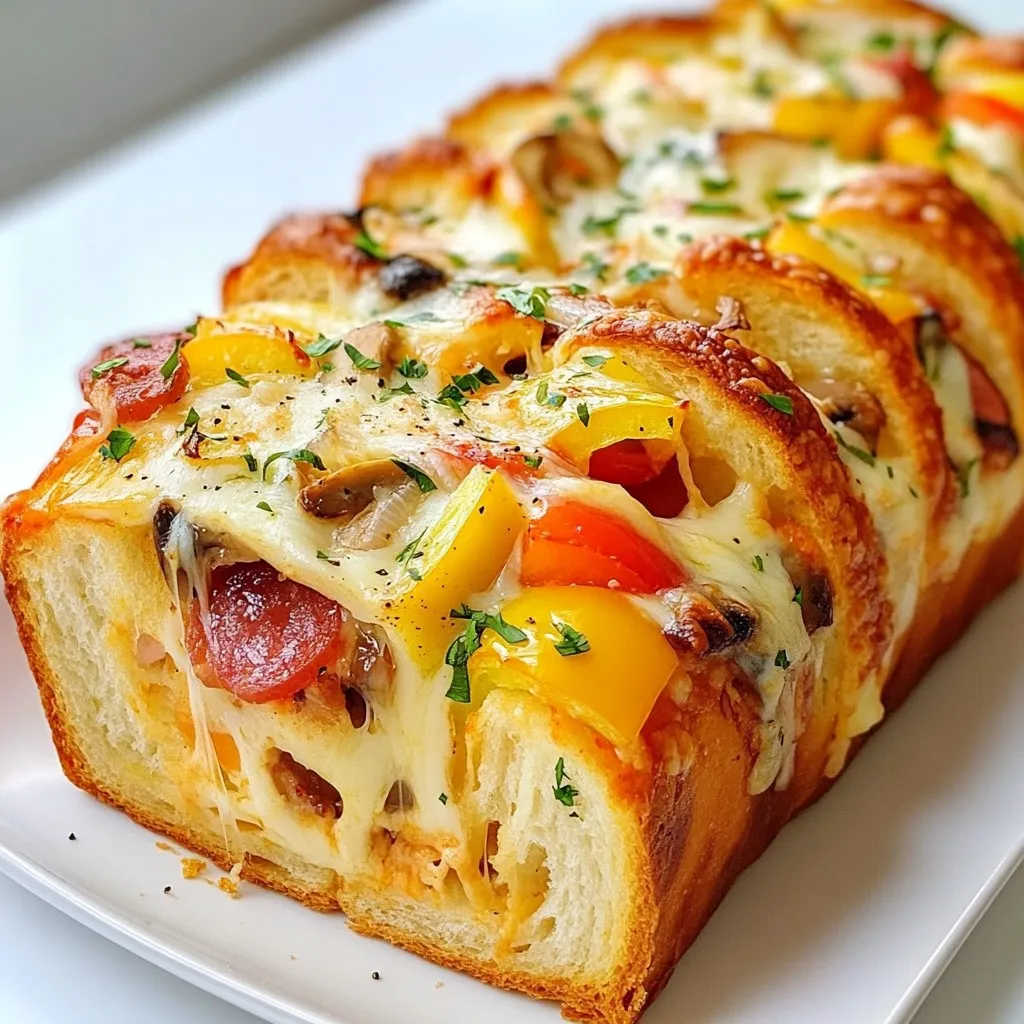 A deliciously stuffed bread filled with cheese, vegetables, and meats.