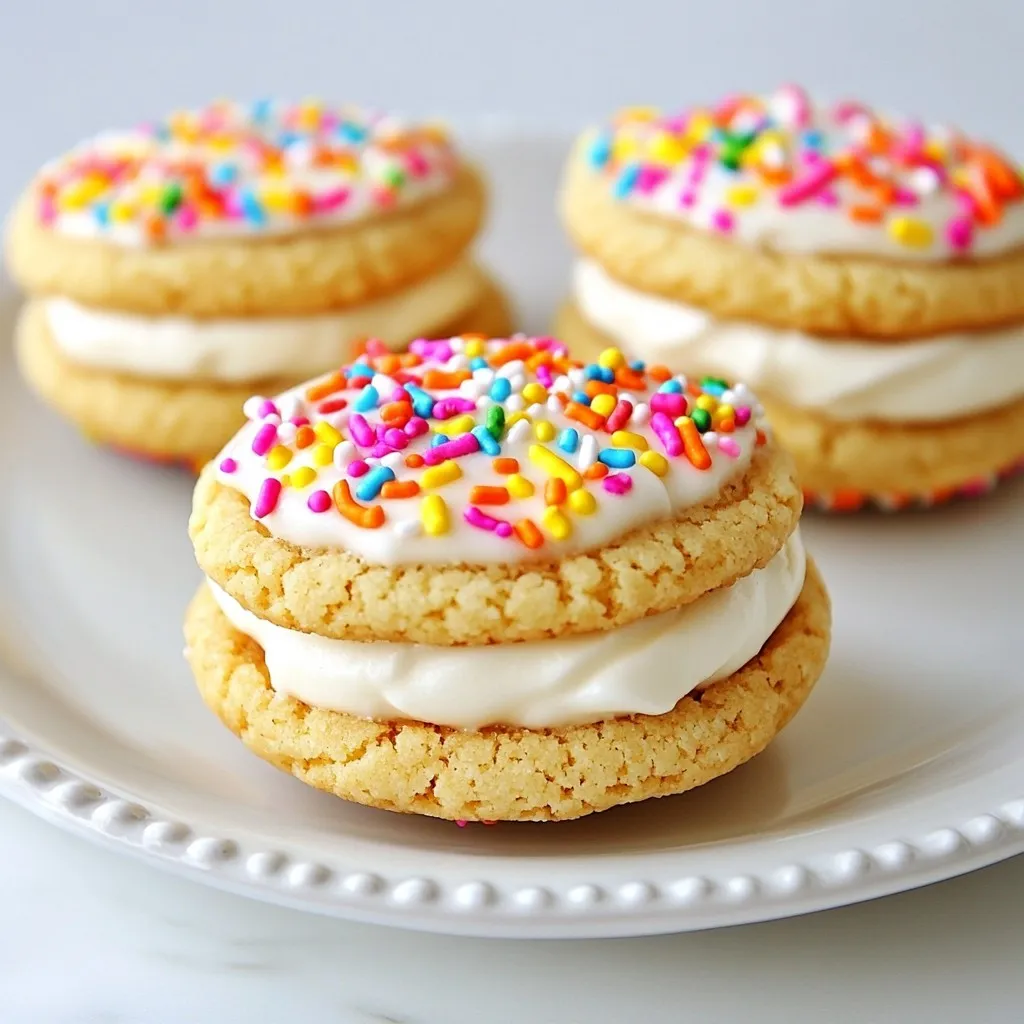 Delightful sandwich cookies filled with vanilla frosting and decorated with rainbow sprinkles.