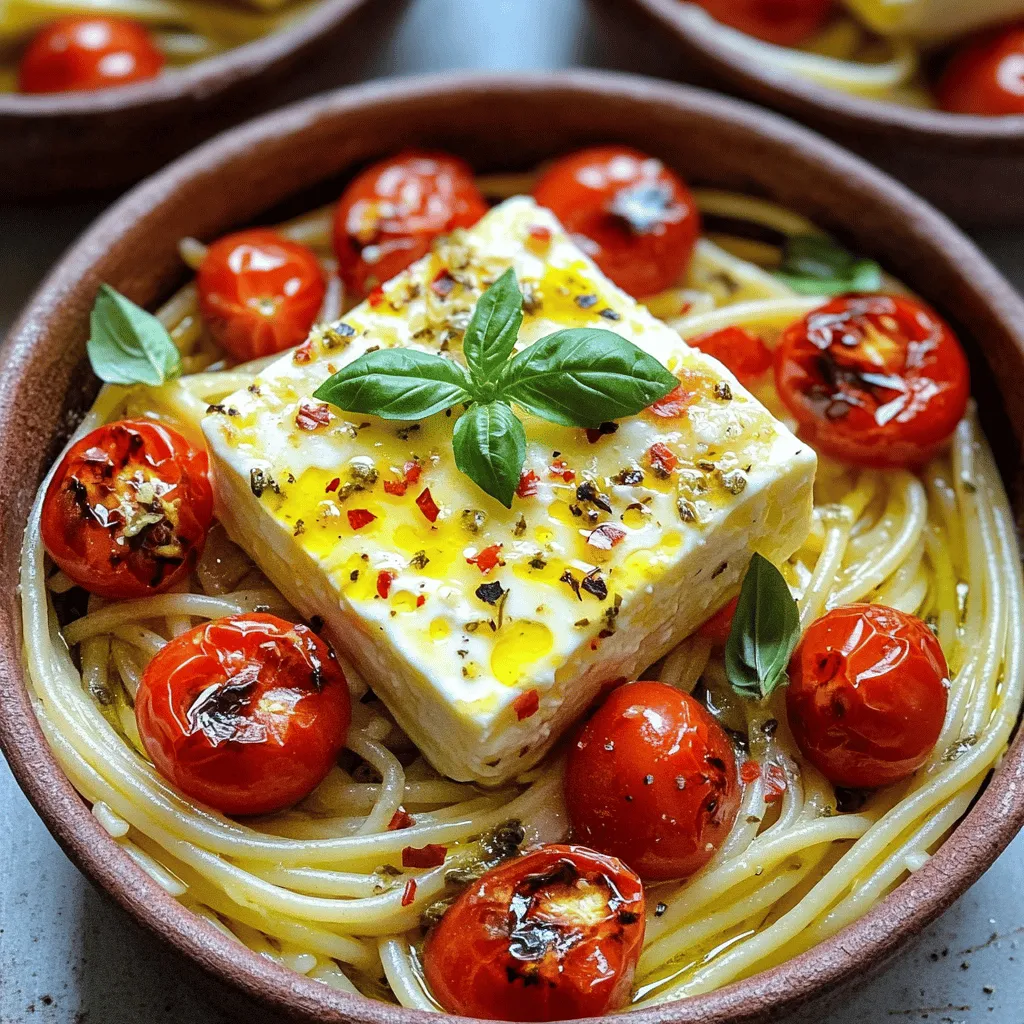 - 1 block (8 oz) feta cheese - 2 cups cherry tomatoes, halved - 3 cloves garlic, minced - 1/4 cup extra virgin olive oil - 1 teaspoon dried oregano - 1/2 teaspoon red pepper flakes (adjust to taste) - Salt and pepper to taste - 12 oz pasta (penne or fusilli works best) - Fresh basil leaves for garnish - Zest of 1 lemon This recipe shines with fresh, simple ingredients. Start with a block of feta cheese. I love using high-quality feta; it melts perfectly. Next, grab some cherry tomatoes. Halve them to let their juices mix with the feta. Garlic brings a wonderful aroma, so don’t skip it. Olive oil adds richness. Use extra virgin for the best flavor. Dried oregano gives an earthy hint. Red pepper flakes add a nice kick, but you can adjust them. Salt and pepper are essential for taste. Choose your favorite pasta, like penne or fusilli, to hold the sauce well. For garnish, fresh basil and lemon zest add brightness. They will make your dish pop. With these ingredients, you can create a dish that is creamy, flavorful, and truly delightful. Set your oven to 400°F (200°C). This step gets your oven hot and ready. Grab a 9x13 inch baking dish. Place the block of feta cheese in the center. Surround it with halved cherry tomatoes, cut side up. Scatter the minced garlic around the tomatoes. This setup helps the flavors blend well. Drizzle extra virgin olive oil over the feta and tomatoes. Sprinkle on dried oregano, red pepper flakes, salt, and pepper. This seasoning brings out the best taste. Now, bake the dish for 25 to 30 minutes. You want the feta to soften and the tomatoes to blister. While the feta and tomatoes bake, cook the pasta. Follow the package instructions until it's al dente. Remember to reserve 1 cup of pasta water before draining. This water helps adjust the sauce later. After baking, take the dish out of the oven. Use a fork to mash the feta and mix it with the tomatoes and garlic. This creates a creamy base. Add the drained pasta to the dish. Toss gently to combine. Use reserved pasta water as needed to reach your desired sauce consistency. Check the taste and adjust the seasoning if needed. Top your pasta with fresh basil leaves. Grate some lemon zest over it for a fresh touch. This step adds brightness to the flavor. Enjoy your meal! To make your baked feta tomato pasta shine, focus on seasonings. Start with the red pepper flakes. If you like heat, add more. If not, keep it light. For a creamy sauce, mash the feta well with the tomatoes. Be sure to mix in some reserved pasta water. This step helps make the sauce smooth and rich. Presentation matters! Serve the pasta in individual bowls. Top each bowl with fresh basil leaves. A drizzle of olive oil adds a nice touch. For a cheesy flavor, sprinkle freshly grated Parmesan on top. The bright colors of the tomatoes and basil make it look appetizing and inviting. You don't need fancy gadgets for this dish. Here are the essentials: - 9x13 inch baking dish: Holds all your ingredients. - Fork: Perfect for mashing the feta and mixing. - Pot: Use for cooking the pasta. - Ladle: Helps you serve the pasta easily. These tools make cooking simple and fun. Enjoy making this dish! {{image_4}} Feel free to switch up the cheese or veggies in this dish. If feta isn’t your favorite, try goat cheese or ricotta. Both add great creaminess. For veggies, you can use grape tomatoes, bell peppers, or even zucchini. Each swap brings a new twist to the flavor. You can easily make this dish vegan. Just replace feta with a vegan cheese. Nutritional yeast can add a cheesy taste too. For gluten-free options, swap regular pasta for gluten-free pasta. It will cook the same and taste just as good. Want to add some protein? Chicken, shrimp, or chickpeas work well. For chicken, grill or sauté it first. Then mix it in with the pasta. If you prefer shrimp, add it for the last few minutes of baking. Chickpeas can be added straight from the can. They will soak up all the yummy flavors. To store your delicious baked feta tomato pasta, let it cool first. Place it in an airtight container. Refrigerate it for up to three days. When you want to reheat, use a microwave or oven. If using the oven, cover it to keep moisture. Heat until warmed through, about 15 minutes at 350°F (175°C). This keeps the pasta creamy and tasty. Freezing this dish is a great way to save it for later. First, let the pasta cool completely. Then, divide it into meal-sized portions. Use freezer-safe bags or containers. Squeeze out the air to prevent freezer burn. It will last up to three months in the freezer. When ready to eat, thaw it in the fridge overnight. Reheat it in the oven or microwave until hot. The shelf life of baked feta tomato pasta in the fridge is about three days. After that, the taste and texture may change. If you notice any odd smells or changes in color, it’s best to toss it. Always check before eating leftovers to stay safe. Yes, you can swap feta with other cheeses. Goat cheese adds a tangy taste. Cream cheese gives a creamy texture. If you prefer a stronger flavor, try blue cheese. Just remember, each cheese will change the dish's taste a bit. Penne and fusilli work best in this recipe. Penne holds the sauce well in each tube. Fusilli, with its twists, grabs the sauce nicely. Other options include farfalle or rotini, which are fun and tasty too. To add spice, use more red pepper flakes. Start with a teaspoon for a kick. You can also include fresh chili peppers or a dash of hot sauce. Just be careful; you can always add more heat, but it’s hard to take it away! This dish combines feta cheese, cherry tomatoes, and pasta for a tasty meal. I provided step-by-step instructions to ensure you can easily make it at home. Remember to season well and add fresh herbs for flavor. You can also swap ingredients or adjust the recipe to fit your needs. Storing leftovers properly helps keep your meal fresh. Enjoy cooking and experimenting with flavors! Your efforts will make every bite 