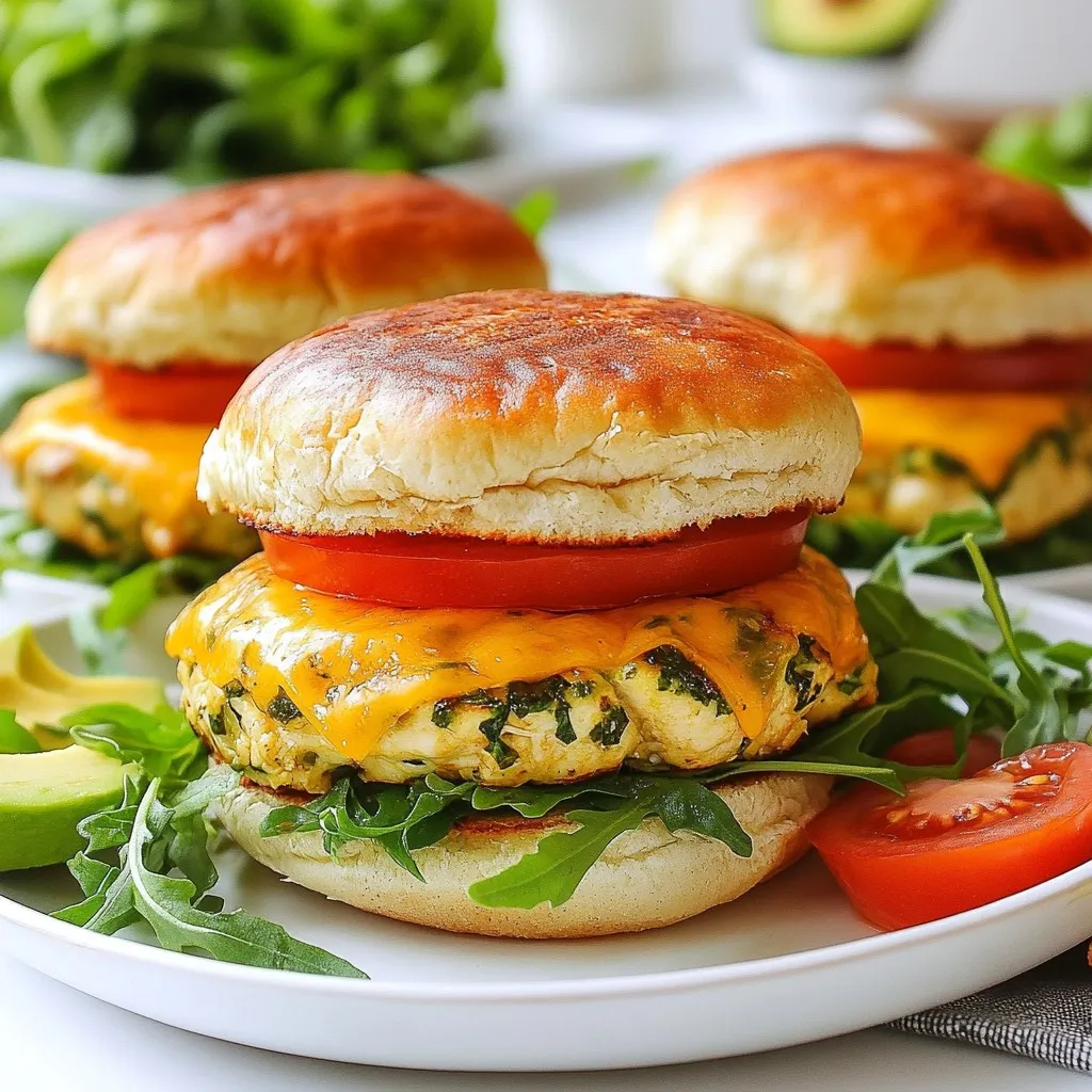 Delicious chicken burgers infused with white cheddar and fresh spinach, perfect for a healthy meal.