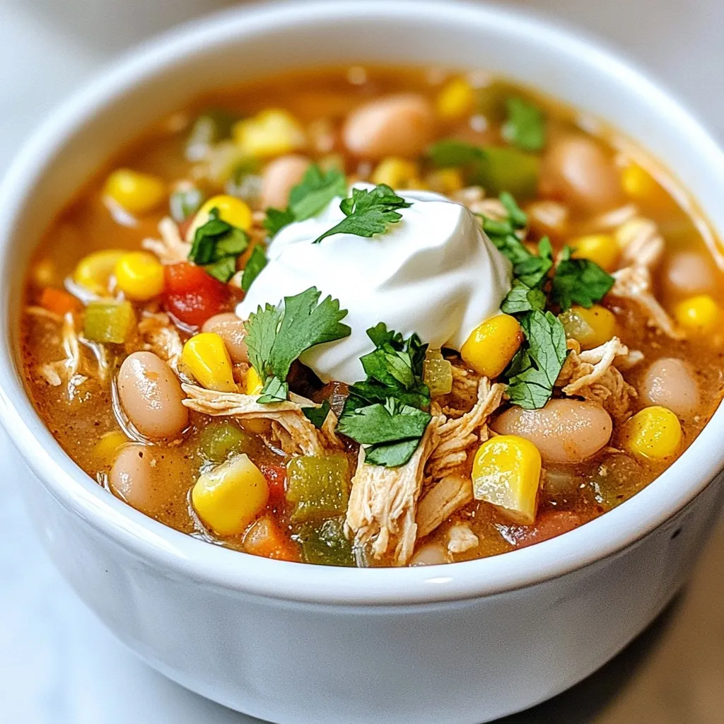 - 2 cups cooked chicken, shredded - 1 can (15 oz) white beans (cannellini or great northern) - 1 cup corn (fresh, frozen, or canned) - 1 medium onion, finely diced - 2 cloves garlic, minced - 1 green bell pepper, finely diced - 2 cups low-sodium chicken broth - 1 teaspoon ground cumin - 1 teaspoon chili powder - ½ teaspoon paprika - ½ teaspoon cayenne pepper (adjust based on your heat preference) - ¼ cup fresh cilantro, chopped (plus more for garnish) - Salt and freshly ground black pepper to taste - 1 tablespoon olive oil - Optional toppings: sour cream, shredded cheese, sliced jalapeños, or diced avocado White chicken chili is hearty and filling. The main ingredients create a creamy and rich blend. I use cooked chicken to save time. Shredded chicken works well and adds flavor. White beans give a creamy texture and add protein. Corn adds a sweet crunch, balancing the spice. Onions and garlic bring a warm base. Diced bell pepper adds color and sweetness. The low-sodium chicken broth provides a rich flavor without too much salt. Seasoning is key. Cumin and chili powder give depth. Paprika adds a smoky note, while cayenne brings heat. Adjust cayenne to your liking. Fresh cilantro brightens the dish. You can add toppings like sour cream, cheese, jalapeños, or avocado. These toppings add extra flavor and texture. Gather these ingredients, and you will have a great start to making white chicken chili. {{ingredient_image_2}} 1. Start by heating the olive oil in a large pot over medium heat. 2. Once hot, add the finely diced onion. Sauté it for about 5 minutes. The onion should turn translucent and fragrant. 3. Next, add the minced garlic and diced green bell pepper to the pot. Sauté this mix for 2-3 minutes. The peppers should become tender. 1. Gently stir in the shredded chicken, rinsed white beans, and corn. 2. Pour in the low-sodium chicken broth. Add ground cumin, chili powder, paprika, and cayenne pepper. Start with half the cayenne for less heat. 3. Toss in the chopped cilantro, but save a bit for later. Mix everything until it is well combined. 1. Bring the chili mixture to a gentle simmer. Then, reduce the heat to low. 2. Let the chili cook uncovered for about 20-25 minutes. Stir it occasionally to prevent sticking. This helps meld the flavors. 3. After cooking, taste the chili. Season with salt and freshly ground black pepper. If you want more heat, add more cayenne pepper. 4. Serve hot, garnished with the reserved cilantro. You can also add optional toppings like sour cream, shredded cheese, jalapeños, or diced avocado. For white chicken chili, I recommend using cannellini or great northern beans. These beans are creamy and hold their shape well. For chicken, shredded cooked chicken works best. You can use rotisserie chicken for ease. Fresh corn adds sweetness, but frozen corn is a great time-saver too. Just make sure to thaw it before use. To spice things up, adjust the cayenne pepper to your liking. If you prefer a milder chili, use less. If you want more heat, add more as it cooks. For a thicker chili, try mashing some beans with a fork. You can also add a cornstarch slurry or reduce the liquid by cooking it longer. I love serving this chili with warm bread or fluffy rice on the side. It makes the meal heartier. For toppings, get creative! Sour cream adds creaminess, while shredded cheese brings flavor. Sliced jalapeños give a nice kick, and diced avocado adds a rich texture. Each topping changes the dish and makes it special. Pro Tips Enhance the Flavor: Consider adding a splash of lime juice before serving for a bright, zesty finish. Meal Prep Friendly: This chili stores well! Make a double batch and freeze leftovers for an easy meal later. Customize Your Heat: Adjust the cayenne pepper to your spice preference, or add fresh jalapeños for extra heat. Garnish Wisely: Use a variety of toppings like avocado and cheese to give each bowl a personal touch and texture. {{image_4}} You can make your white chicken chili lighter by using low-fat chicken. Ground turkey works well too. These swaps cut fat but keep the taste. For beans, consider using lentils or chickpeas. They offer good protein and flavor. If you want a meatless chili, use plant-based proteins. Tofu or tempeh can replace chicken. You can also use more beans for protein. For toppings, try dairy-free sour cream or avocado. You still get creaminess without dairy. Adding more herbs and spices can change your chili’s flavor. Try oregano or thyme for a fresh twist. For a Southwest vibe, add chipotle powder or smoked paprika. If you want a Mexican touch, use fresh lime or jalapeños. These changes can make your chili exciting and new! To keep your white chicken chili fresh, follow these tips: - Refrigeration: Place cooled chili in an airtight container. Store it in the fridge. It should stay good for up to 4 days. - Freezing: For longer storage, freeze the chili. Use freezer-safe bags or containers. Leave space for expansion. It can last for up to 3 months in the freezer. You can reheat your chili in two main ways: - Microwave: Pour the chili into a bowl. Cover it with a microwave-safe lid or wrap. Heat in short bursts, stirring between. This helps it heat evenly. - Stovetop: Pour the chili into a pot. Heat on low. Stir often to prevent sticking. This method keeps the texture nice and smooth. The shelf life of your chili is important: - In the fridge: It lasts about 4 days if stored properly. - In the freezer: It remains safe to eat for up to 3 months. After that, it may lose flavor and texture. White chicken chili is a creamy soup made with chicken and white beans. It differs from traditional chili, which often uses beef and red beans. This dish brings a lighter taste with a mix of spices. You can also add corn for extra sweetness and texture. The base usually includes chicken broth, making it hearty but not too heavy. Yes, you can use rotisserie chicken! It saves time and adds great flavor. The pros include convenie